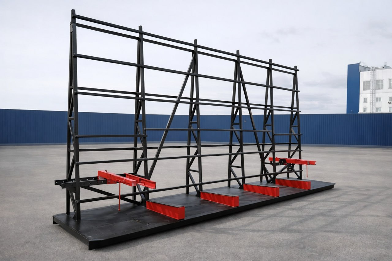 Специализированные системы для перевозки крупноформатного стекла в полуприцепах. Пирамиды JAMBO обеспечивают надежную фиксацию листов при транспортировке, исключая их смещение и деформацию в пути. Конструкция гасит дорожные вибрации, распределяет нагрузку равномерно и позволяет перевозить стекло в горизонтальном положении с минимальным риском повреждения кромок.