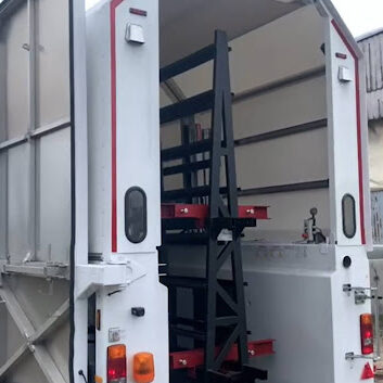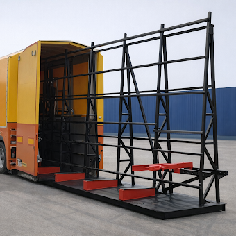 Двусторонняя стойка высотой 9 м для полуприцепов Inloader. Подходит для транспортировки листового и широкоформатного стекла, зеркал, витражей DLF, JUMBO, PLF.